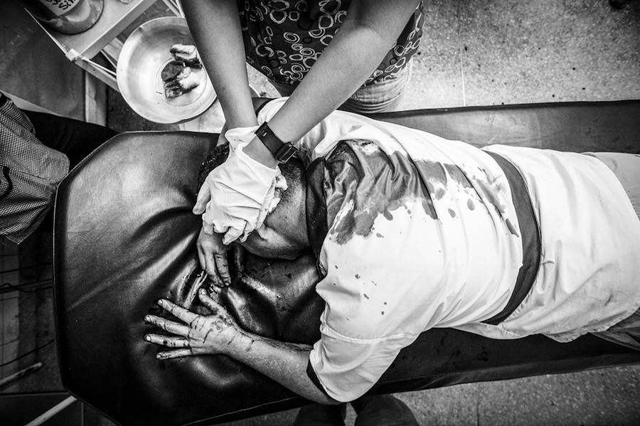 7 May 2011 - Caracas, Venezuela - A nurse tends a deep wound on the head of Rafael Marquina Sanchez, 35, who was hit in the head with a bottle as he was attacked and robbed by a groups of assailants outside a Metro station on a Saturday night, at the Perez de Leon hospital in the Petare slum in Caracas. Venezuela has one of the highest murder rates in the world, and at least 387 people were killed in Caracas in April, 2011, and 72 more so far in May, most due to gunshot wounds. The Perez de Leon hospital lacks the most basic supplies, including gauze, antibiotics, anesthesia, syringes, sutures, and x-rays, as well as lacking qualified doctors and surgeons. Photo Credit: Charles Mostoller/Sipa Press
